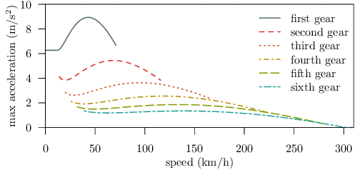 Pozioma oś to prędkość, a pinowa to przyspieszenie. Poszczególne krzywe to biegi (gears).