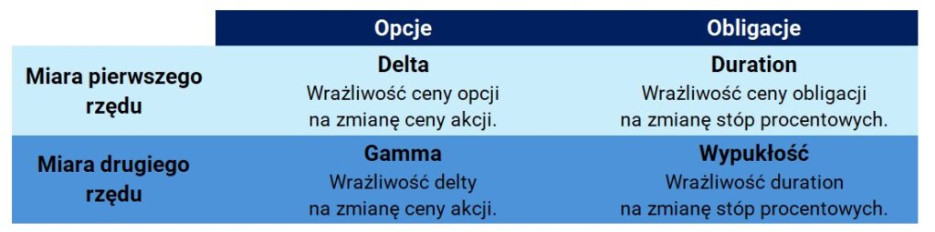 A miarą pierwszego rzędu jest zarówno delta (dla opcji), jak i duration (dla obligacji).